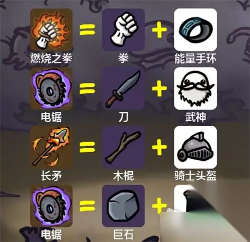 《土豆地下城》超武合成表介绍 1、燃烧之拳=拳=能量手环 2、电锯=刀+武神 3、长矛=木棍+骑士头盔