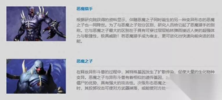 要说这两个僵尸的剧情的话,就不得不先说一下大灾变的两张地图,分别是异乱之战和生化魔方,在这两张地图里面,有两个boss,分别是异形斗兽和极速异形斗兽,没错,他们两者就是恶魔猎手和恶魔之子的完全进化体,剧情是这样发展的。
