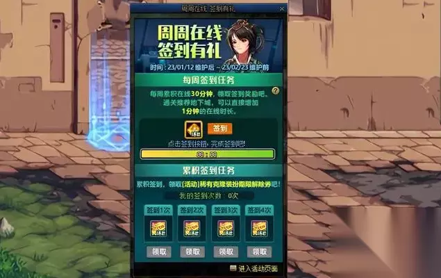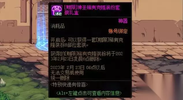 【2】全套史诗装备 打开惊喜礼盒,立即可获得“105级史诗装备套装礼盒”,内含全身12个部位的自选105级史诗,非常夸张的是,可在“普通史诗、贵族机要史诗、寂静城史诗、机械战神史诗”中自选,词条等级25级,一秒达成全身机械战神版本装备毕业。 【3】其它奖励 打开惊喜礼盒,还可以获取“12张装备词条等级转移券”和“5个装备材质转换器”。 【二】每周签到,四周变永久 惊喜快递获取的透明天空套,确实要“到期删除”,但是,策划同时设置了配套活动:“每周签到”,可以把期限天空升级成无期限透明天空。 “1.12日—2.23日”期间,每周在线总时长达到30分钟(每刷1次推荐副本,减少1分钟),就能完成每周签到,非常简单,比以往的每周签到需要在线120分钟相比,进行了人性化优化,然后领取对应奖励。