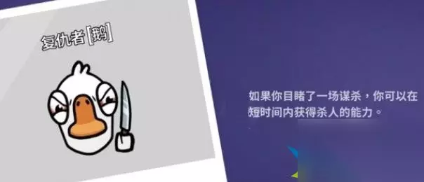 《鹅鸭杀》复仇者是很少拥有刀人能力的鹅,但是达成条件非常苛刻,想要知道复仇者该怎么玩的话请看下面《鹅鸭杀》复仇者技能介绍及玩法技巧,希望能够帮助大家。
