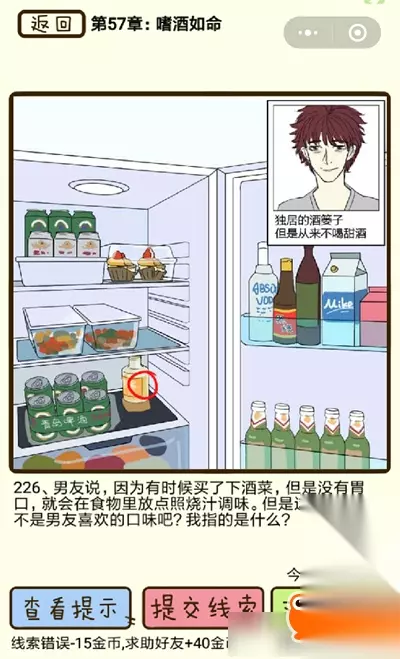 在再见吧渣男手游中嗜酒如命第226关怎么过呢?在再见吧渣男手游中嗜酒如命第226关相信是不少小伙伴们所关心的,那么下面就来看一下吧~! 第两百二十六关 226、男友说,因为有时候买了下酒菜,但是没有胃口,就会在食物里放点照烧汁调味。但是这个完全就不是男友喜欢的口味吧?我指的是什么? 答:我看到冰箱里还有杏露酒,杏露酒的口味甘甜适合女性的口味。本来就不爱喝甜酒的男友冰箱里为什么会有一瓶喝了一半的杏露酒呢?难度是用来招待朋友了么?
