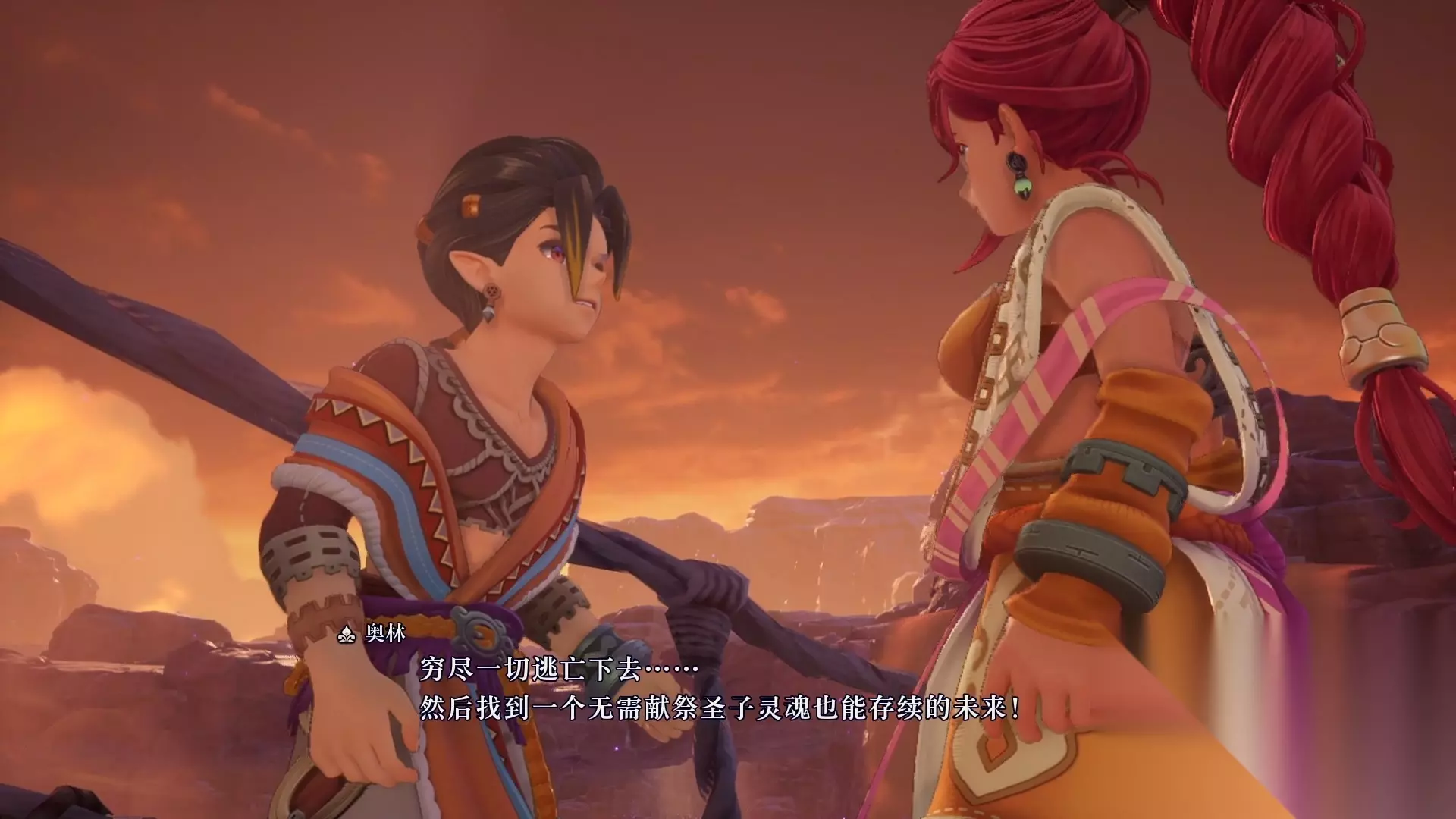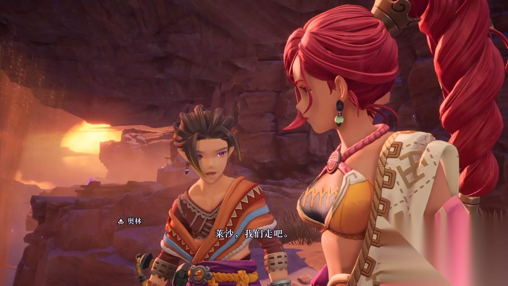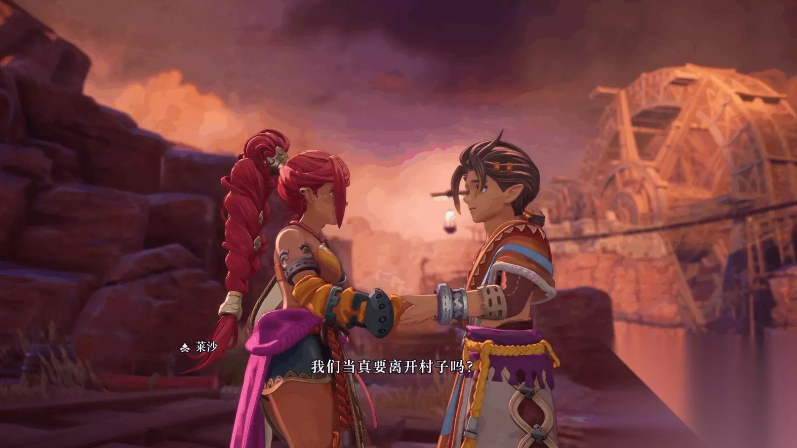接下来画面给到序章的主角,奥林和莱莎,他们准备一起逃离村子,莱莎显得略微犹豫。