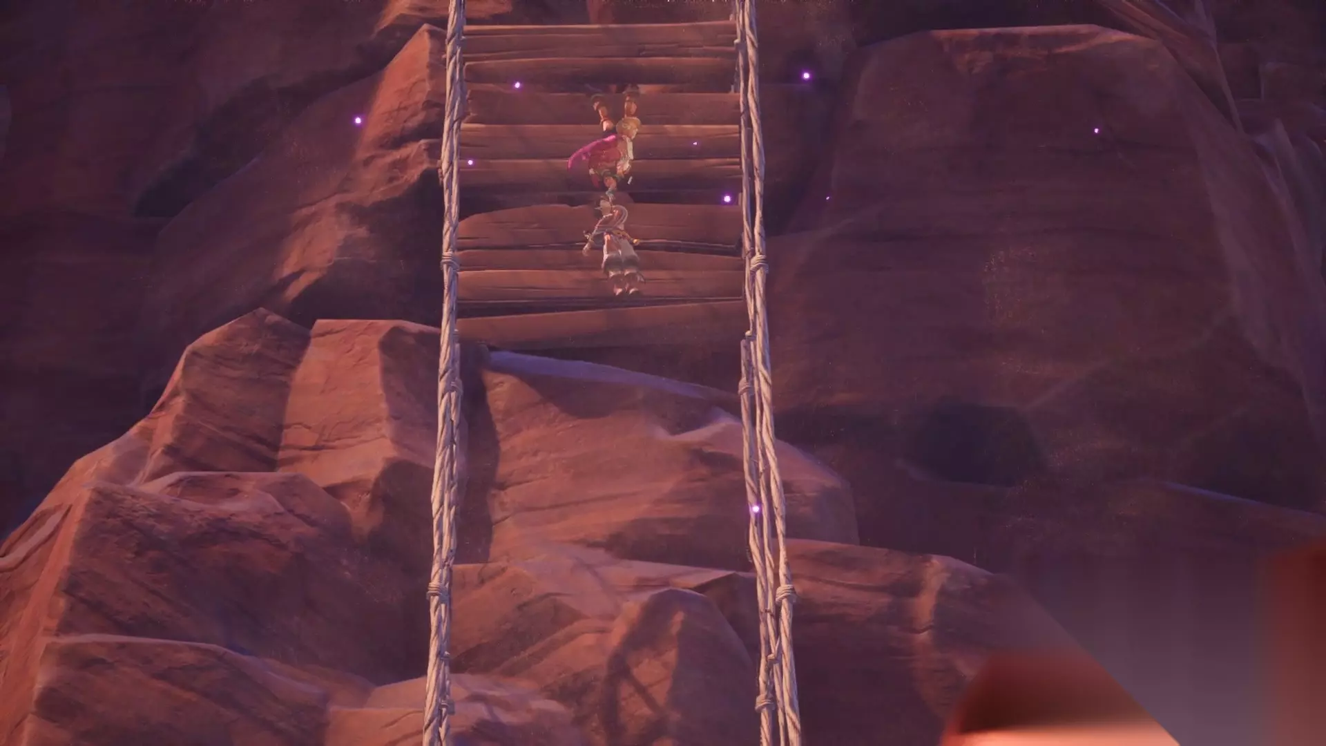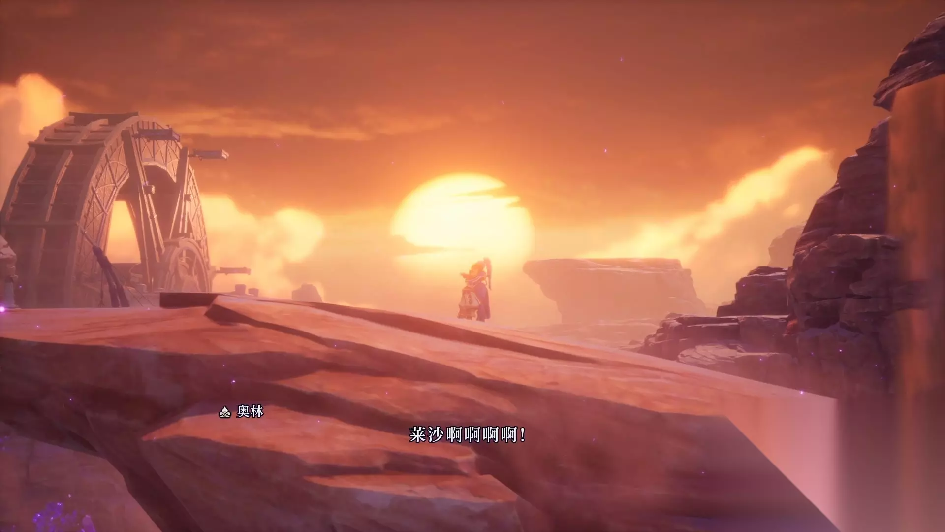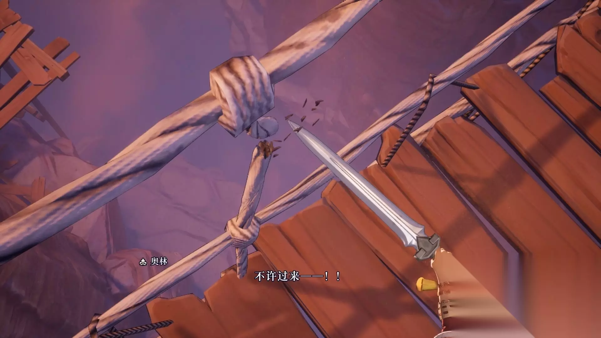 在达南劝说靠近男主的时候,男主示意他不要过来,乱挥剑把桥的绳子给斩断了。