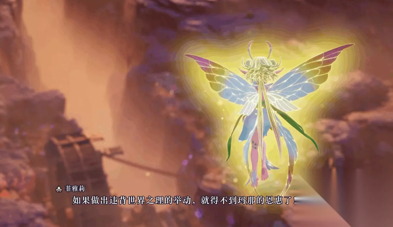 这个会飞的小精灵名叫菲雅莉,她似乎看到了什么,惊讶的说“圣子竟然想要逃跑?”。本作中,圣子需要献祭自己的灵魂,得到玛那的恩惠,不然将会有不好的事情会发生。