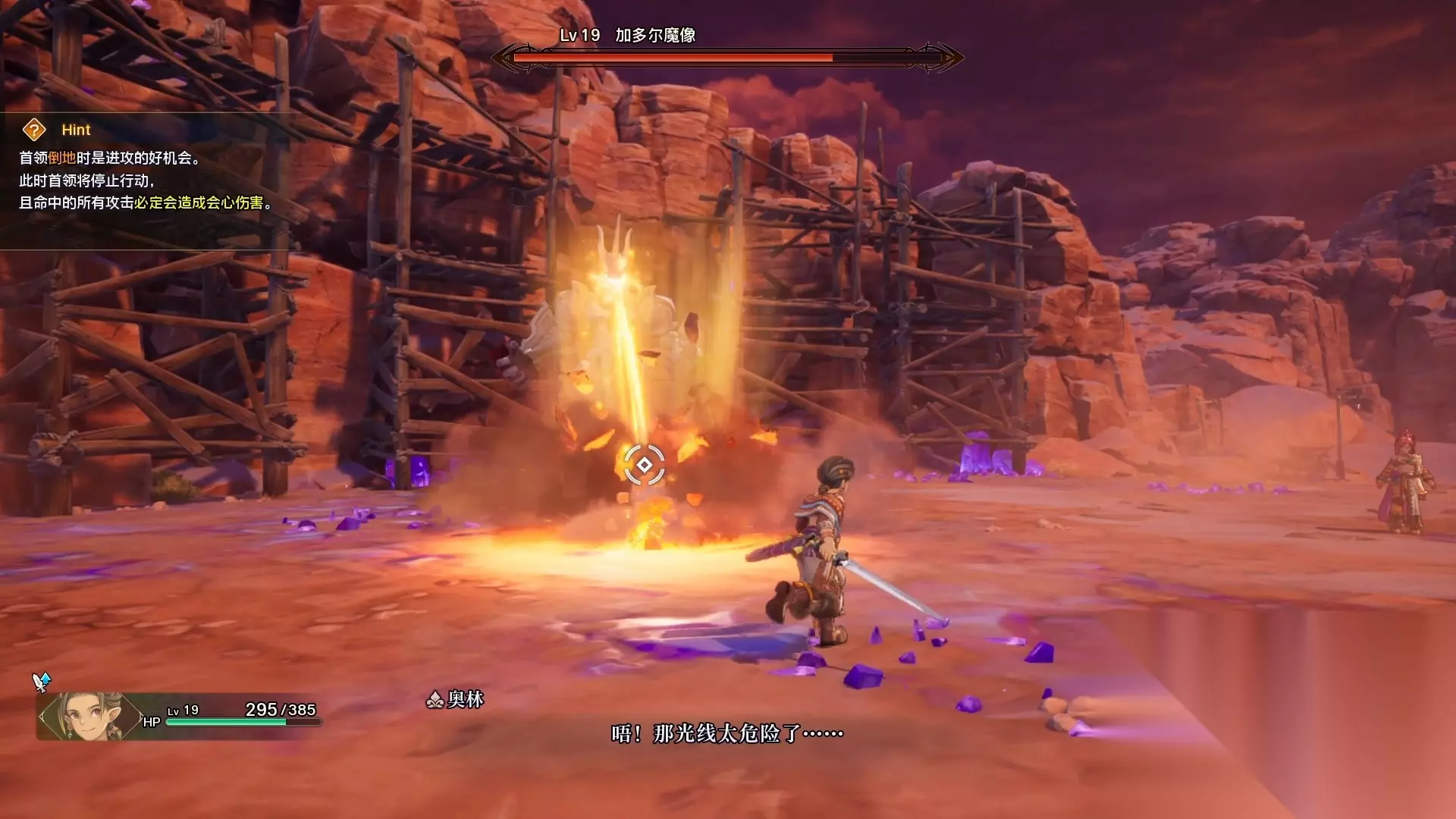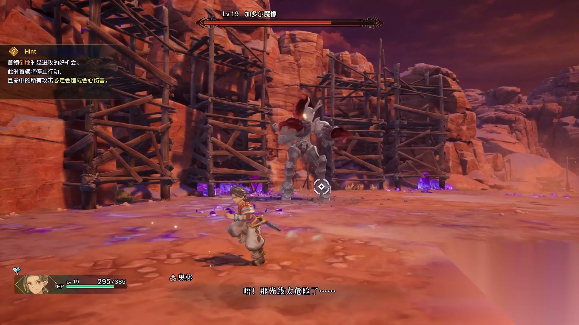 这个巨型魔像的弱点是头部,所以击破脚部让boss倒地攻击头部是最有效的攻击方式,而且命中的攻击将会必定变成会心伤害。