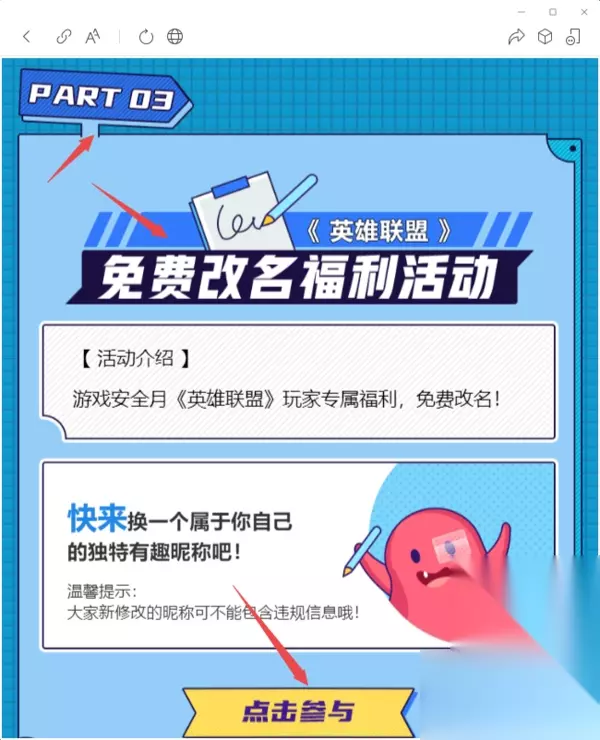 然后在弹出的活动页面中,找到【PART 03】部分的【英雄联盟免费改名福利活动】,接着点击活动下方的【点击参与】按钮。