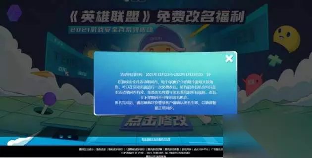 腾讯开启lol英雄联盟免费改名福利活动 近日,腾讯2021年游戏安全月系列活动推出,小编最惊喜的就是英雄联盟游戏的免费改名福利活动,这个lol免费改名的活动时间为2021年12月23日至2022年1月23日晚23:59,lol游戏玩家可以在活动页面上进行1次免费的修改名字的机会。具体活动的规则如下。 lol英雄联盟免费改名福利活动规则 在游戏安全月活动期间内,每个QQ账户下的每个游戏大区角色,可以在活动页面进行一次免费改名。所有的改名机会均只在本活动期间内有效,免费改名将遵守改名系统的所有规则,改名卡下架期间不可使用改名机会。改名完成后,请召唤师尽快登录客户端确认改名生效,以确保数据正常同步。