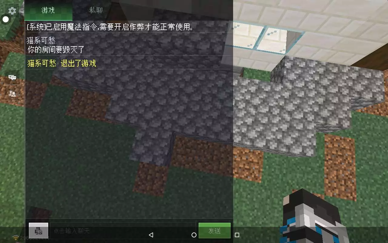 今天下午的时候,我和我姐开了一个房间,我俩辛辛苦苦建了两个小时多的房子,然后进来一个陌生人,我俩就没当回事,然后那个人(Aa柯柯柯阿)开始发神经,先拿火烧了我姐的房子,因为我和我姐的房子都是木头做的,他就趁我俩在灭火的时候又拿TNT炸了我房子,直接给我炸了一半房子,一下午的心血就没了,他个人搞完就出去了,简直有饼。后面就又进来一个人(猫系可愁),不认识的哈,然后不知道他在干什么,因为我俩当时都在修房子,后面他就发了一个“你的房间要毁灭了”就退了,我严重怀疑这个(猫系可愁)和这个(Aa柯柯柯阿)是一伙的,不过不能确定,反正我和我姐的房间可没毁灭,我感觉他就是在恐吓我们。