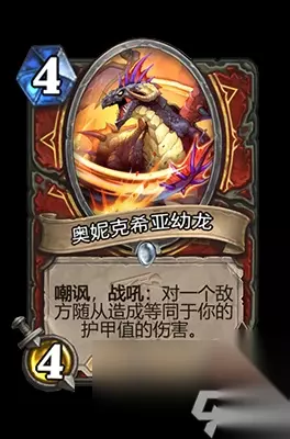 《炉石传说》中的奥妮克希亚幼龙,作为奥妮克希亚的巢穴扩展包中的一员,为战士职业带来了一个独特的随从选择。这张卡牌虽然只需一点法力值就能召唤,且初始攻击力为两点,看似基础属性较为薄弱,但其技能却极具策略性。它拥有嘲讽效果,能够吸引敌方随从的攻击,而其战吼技能更是能对敌方一个随从造成等同于你当前护甲值的伤害。因此,建议玩家在召唤奥妮克希亚幼龙时,尽量增加自身的护甲值,以最大化其战斗潜力。