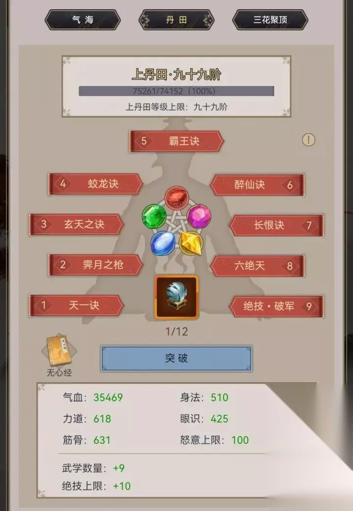 中丹田修炼完毕的大侠将可以在武当议事殿中找张真人学会上丹田修炼之法:无根树。先给九神香30个,然后再给玉精草30个,就可以拿到上丹田秘笈 提升丹田等级所需材料: 上丹田:67-77阶消耗天青丹*4,78-88阶消耗天青丹*8,89-99阶消耗天青丹*12 天青丹出处:在七星堡副本中获取 丹田等级上限为99级