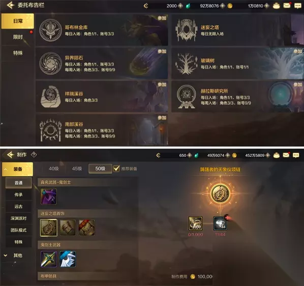 2、踌躇者系列首饰 通过“委托-日常-迷妄之塔”,进入相关副本获取“踌躇者系列首饰”&制作的材料“夜之迷途碎片”。 点击游戏右下角的“打造-制作”,进入相关页面。 选择“装备-普通”,找到对应装备进行制作。