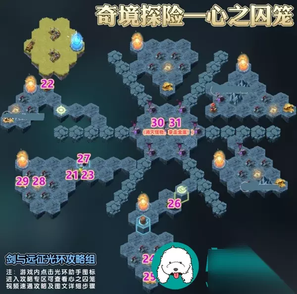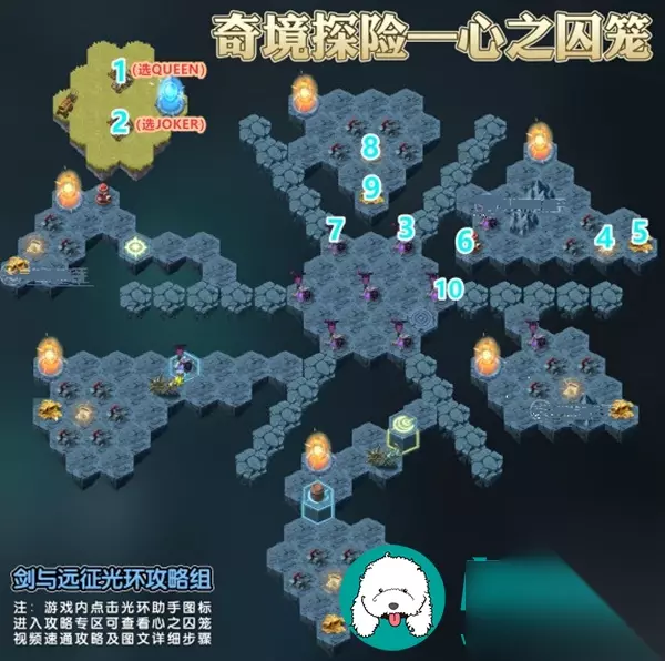 剑与远征心之囚笼攻略 1、到1的位置,在营地处获取新虚空,加入战斗阵容中。 2、到2的位置,在营地处获取新虚空,加入战斗阵容中。 3、进入传送门,到3的位置,消灭怪物阵营。 4、到4的位置,直接获取“心声”。 5、到5的位置,直接获取奖励。 6、到6的位置,操作火炮,消灭下方怪物阵营。 7、到7的位置,消灭怪物阵营。 8、到8的位置,直接获取“心声”。 9、到9的位置,直接获取奖励。 10、到10的位置,消灭怪物阵营。