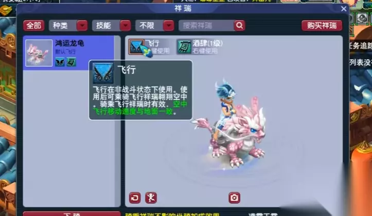 首先你得有一个真正的飞行祥瑞。最直接的获取方式是使用仙玉在游戏内的商城购买,最便宜的飞行祥瑞通常需要1200仙玉。如果你有祥瑞赠送的1200仙玉抵扣券,购买时务必选择无技能的祥瑞版本,这样抵扣券才能生效,否则你可能需要支付全额2000仙玉。购买无技能祥瑞后,你可以再前往祥瑞技能界面,单独花费仙玉去学习你需要的实用技能,比如酒肆或巫医。免费的获取途径也存在,例如完成飞天密信任务链,这需要你消耗600点门派贡献找师傅兑换任务,之后完成寻找物品、组队战斗等一系列流程,最终获得神奇的蛋并通过喂养点化来得到免费的流云玉佩飞行祥瑞。