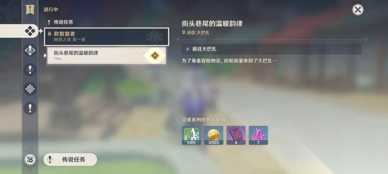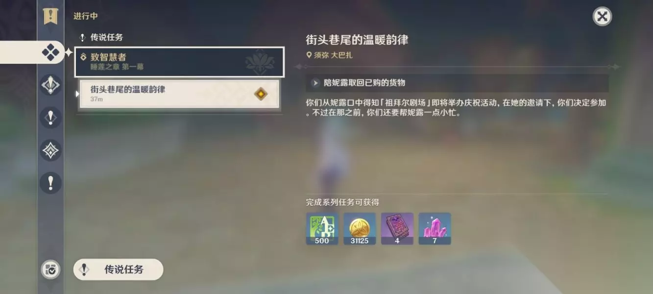 ①前往大巴扎跟妮露对话,开启致智慧者任务,先帮妮露一点小忙,陪妮露取回已购的货物。