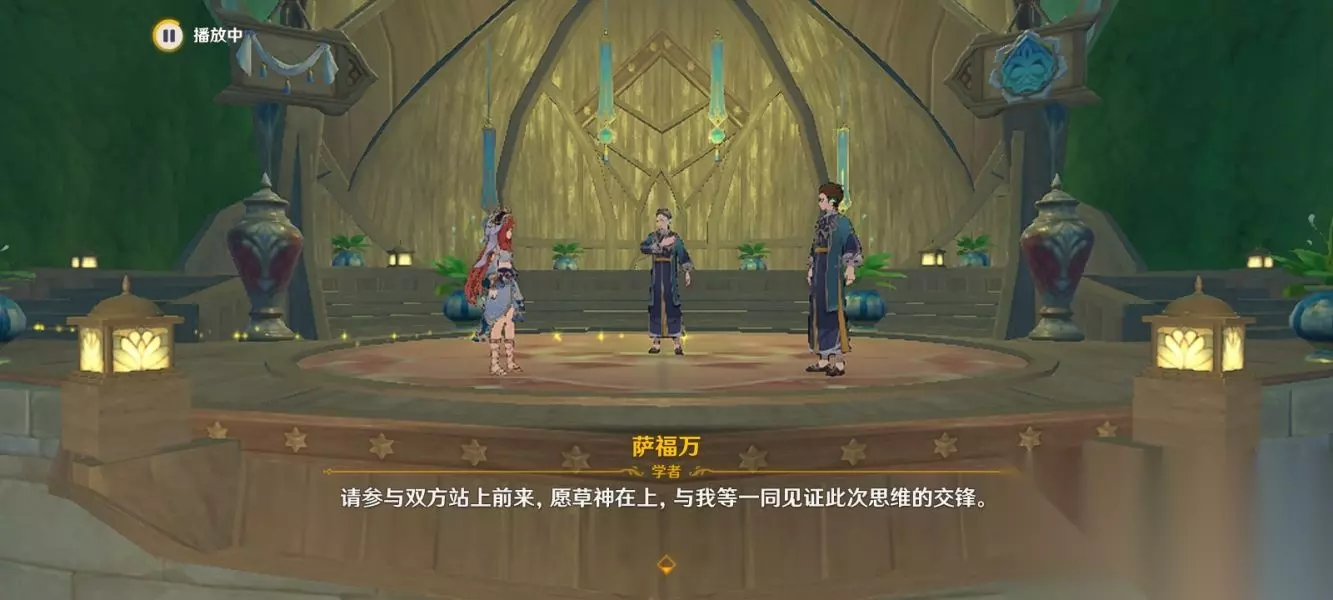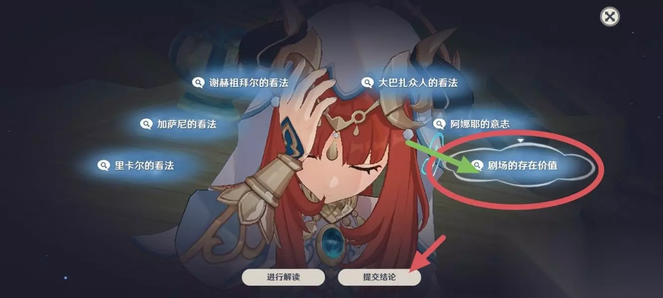 ②与妮露回到剧场舞台,接着和剧场的人谈话,谈完之后再和妮露对话,等待活动开始 。 之后被教令院的人破坏了,要拆除这个剧场舞台,跟妮露讨论现状!