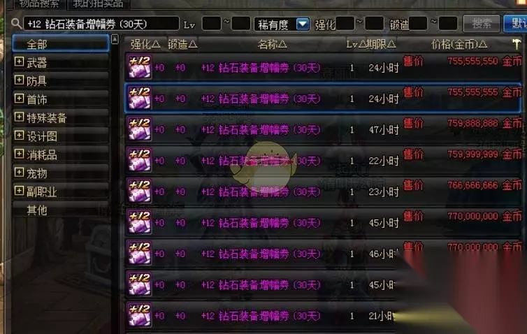 这次天空之城更新的内容是5月9号的版本内容,而在更新之后,在拍卖行上面就可以搜索到+13的黄金/铂金/翡翠/钻石强化券,直接将可交易的13强化券剧透给了玩家。这意味着很快,魔盒就将加入这批可以交易的13强化券,到时候又必将掀起新的一轮氪金风暴。