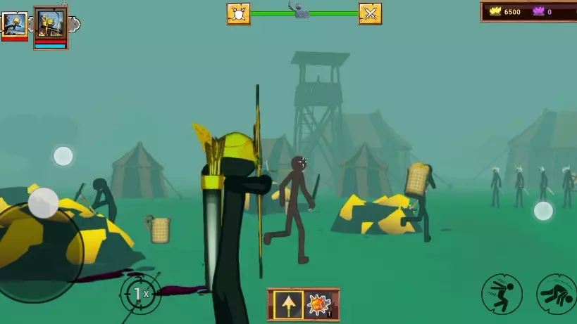 这是《火柴人战争遗产》的战役内容,展示了疯狂战役叛军教程关,也就是第六章镰刀熊关卡的战斗过程,能看到火柴人部队对战敌方单位、水晶资源点等战斗场景,呈现了该关卡的战斗玩法。