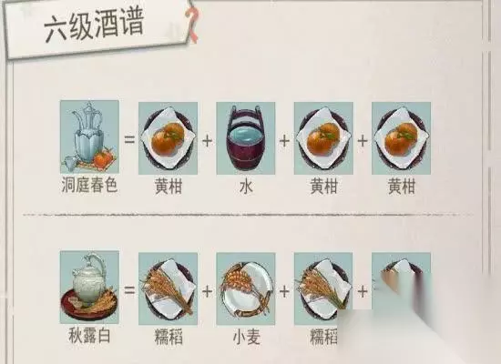 6级酒谱制作全攻略 1、洞庭春色是第一种,需要三份黄干和一份水,制作时先放黄干再放水,最后加两份肪肝。2、秋露白得准备三份糯米稻和一份小麦,小麦放第二个位置。3、黄桂稠酒要两份桂花、一份糯米和一份水,顺序是桂花、水、糯米,最后再放桂花。4、地黄酒需要两份地黄、一份糯米稻和一份水,地黄放第一个和最后一个。5、花雕酒准备三份糯米和一份水,水放第二个位置。