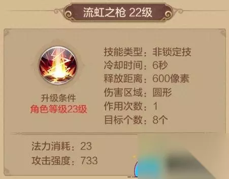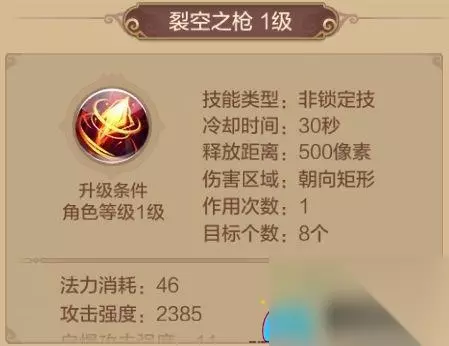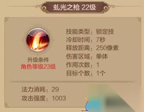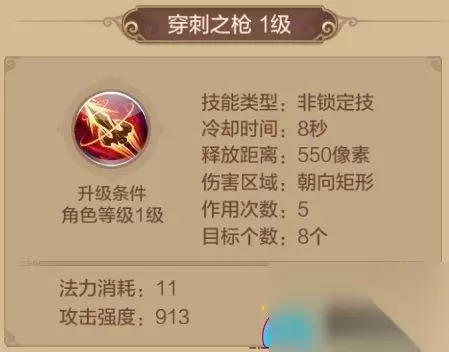 虬光之枪 1级解锁的技能,冷却时间7秒,对选中目标造成1次物理伤害。 其被动技能附带[溅射]及提高自身物理攻击。千万别小看1级就能解锁的技能哦,其攻击力度其实并不小, 而且加上被动技能提高自身物理攻击,在PVP的时候可以说是很好用了,而且冷却时间也较短,所以该技能必带。