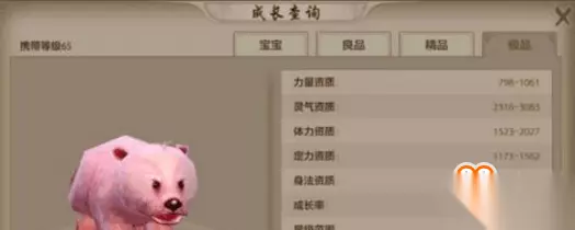豹子珍兽 北极熊:65级可以携带,玄武岛捕捉,内功型灵气珍兽。