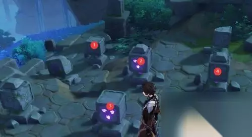 2.接着前往曚云神社处 解密攻略:按照顺序击打①两次,击打②三次,击打③一次。 机关运行原理:让四个旋转的立体方块全部都面朝向内侧,即可让雷灵离开。 小提示:雷灵机关的旁边还有一个雷指针的机关,可以解锁另一个雷灵