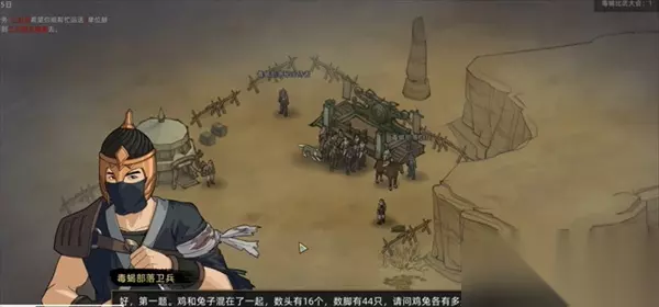 在部落与弯刀游戏里的武道大会任务里,玩家会遇到答题剧情,玩家需要正确回答三个题目才可以,第一题的答案是兔子6只、鸡10只,第二题的答案是21人,第三题的答案是10人,最后还有帮助哪个部落的选项,这个玩家可以根据自己的喜好进行选择。 部落与弯刀武道大会答题 1、在部落与弯刀游戏里,玩家在进行武道大会剧情时需要回答三个问题。 2、第一个问题是鸡兔同笼的数量问题,答案是兔子6只、鸡10只。