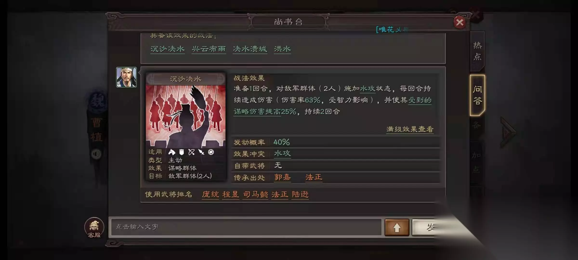 徐庶的自带战法处兹不惑虽然发动概率只有35%,但一旦触发,能对敌方施加灼烧、中毒或溃逃等负面状态,并且三种状态独立判定,运气好的话能打出爆炸伤害。不过这个战法比较看脸,下限低但上限极高,适合喜欢拼运气的玩家。由于徐庶的智力成长不错,但比不上一线谋士,所以更适合作为副输出或辅助位登场。