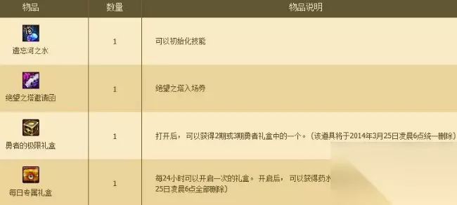 dnf巅峰之力礼盒奖励如下: 遗忘河之水*1 绝望之塔邀请函*1 勇者的极限礼盒*1 每日专属礼盒*1