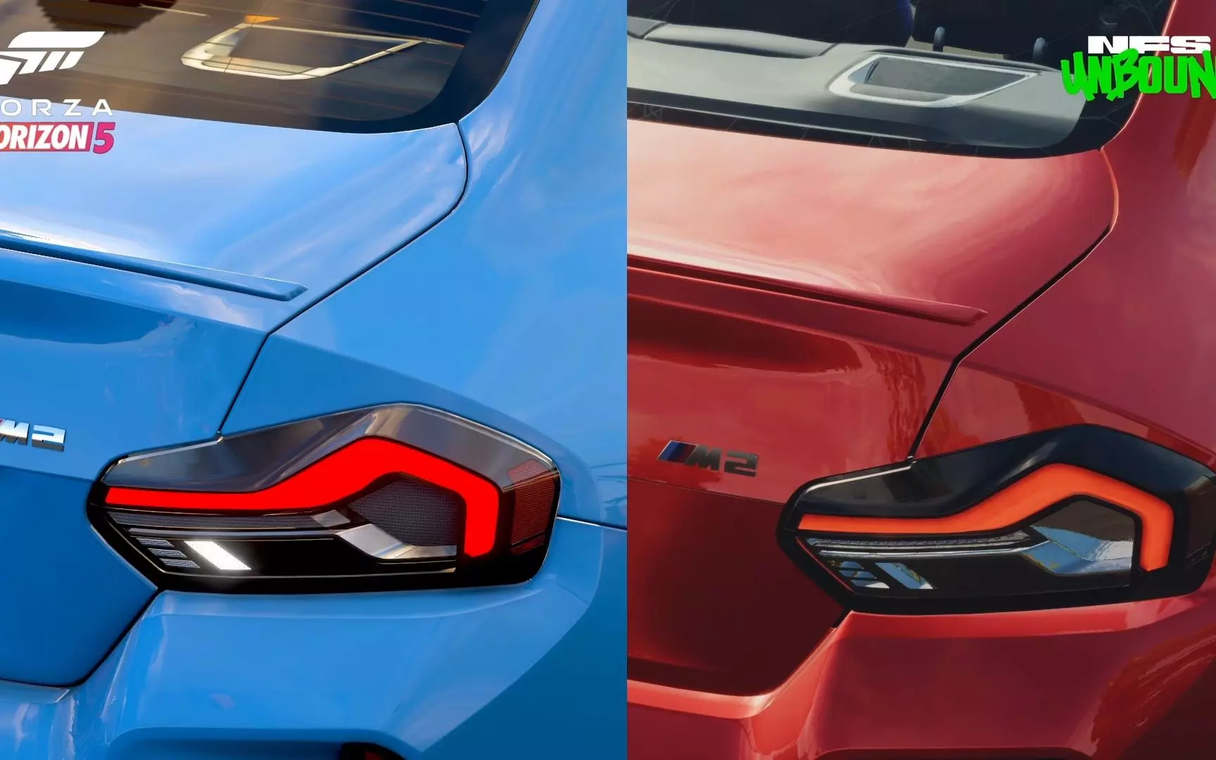 游戏为《极限竞速:地平线5》和《极品飞车:不羁》 对比用车型为2023款宝马M2 两边都是新出的车所以应该都是新建的模(主要是天天看有人说建模质量问题跟新模老模…