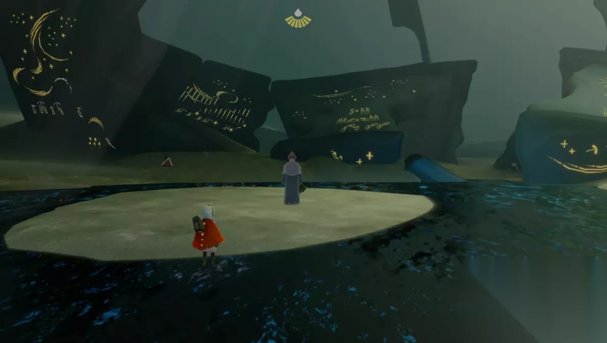 最先遇到的瞌睡木匠先祖就在沉船左侧,她带着可爱的公主头造型很好辨认。收集方式是运火,沿着船体小心移动别让火苗熄灭。接着往船尾方向飞,能在左后方发现赞许壁画家先祖,需要耐心跟随光点轨迹。这两个先祖位置相对集中,建议先完成他们。