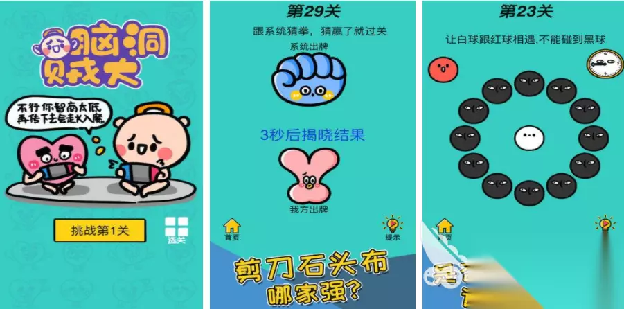 进入到脑洞叠叠乐之后,玩家会进入到一个非常简单的横版卡通场景,在这个场景里会变身成火柴人,需要和其他的对手利用武器不断进行挑战是,但是你这些武器会互相克制,但在里面不会给出直接的提示,玩家需要自行动脑找到规律,这样才能选择最合适的武器击败对手。 高速下载 普通下载 优先233乐园APP下载 2、《脑洞贼大》