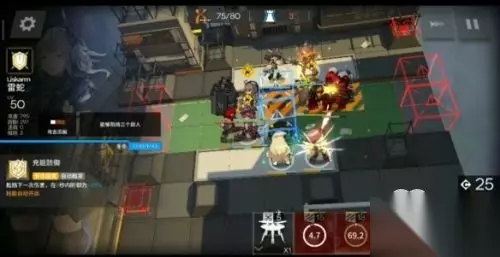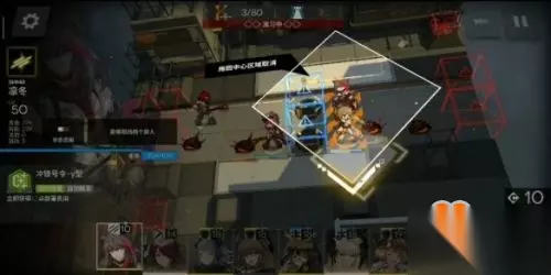 难点来了,左边这时候会刷出两个重型敌人,飞行物也将到达目的地。 我们要做的是先在最左上方格子放下准备好的群攻术士(图中的炎熔),再在中间上面放下二号奶(赫默),补足奶量。 然后将右上角的先锋换成另一个重装准备迎接斧兵。