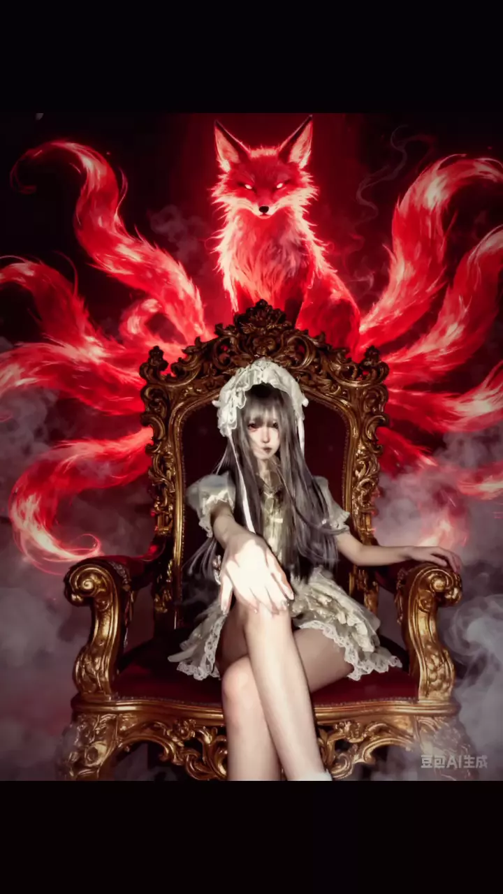 帮我生成图片:要求将人物置于华丽的金色宝座上,背景创作一只带有红色光效、多尾的奇幻狐狸(九尾狐形象)