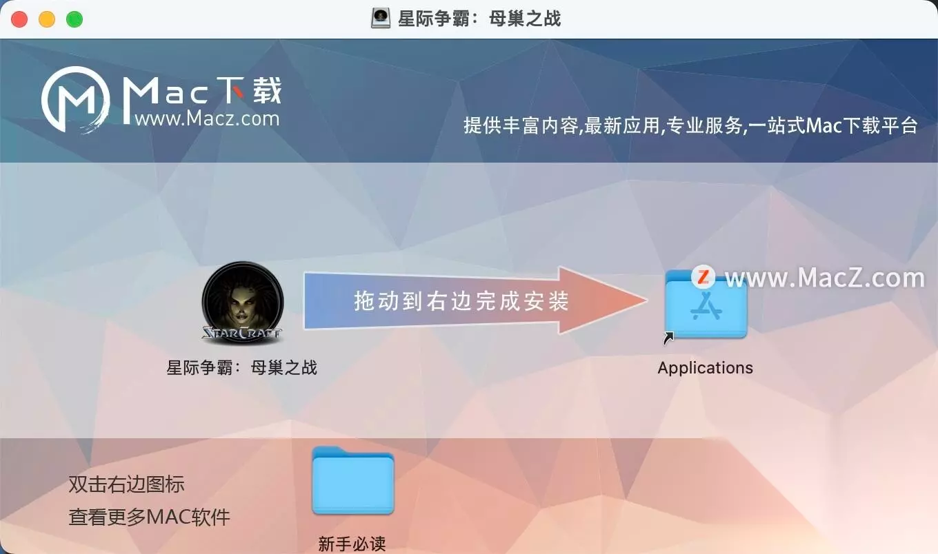 星际争霸 Mac版安装教程 在本站下载完软件后打开,将左侧的软件拖动到右侧的应用程序中进行安装即可!