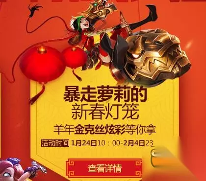 lol暴走萝莉的新春灯笼活动地址,抽皮肤春节活动再度开启!快准备好你的钱包准备来抽一发吧,各种传说、限定皮肤在等着你哦! 活动时间: 1月24日-2月4日 lol暴走萝莉的新春灯笼: