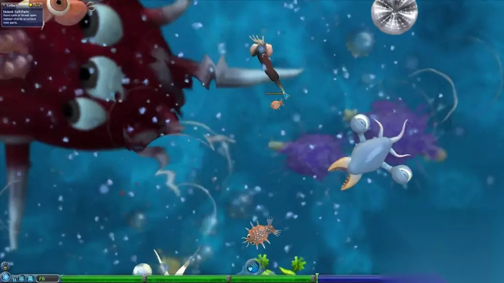 在这款游戏中,玩家将从一个底层生物开始自己的旅程。通过吞噬其他物种,获取道具和DNA。在下方绿色条充满后进化的同时,也能够武装新的游戏道具。最终成为这一片类似水域地区中的霸主。