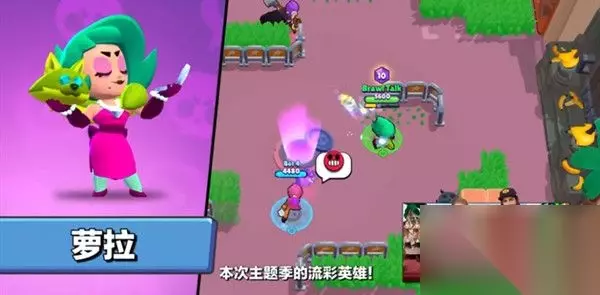 全新流彩英雄:萝拉 萝拉是乱斗好莱坞的电影明星,超级自恋。为了吸引大家的目光,她可是什么都干得出来。另外,她还特别喜欢亮闪闪的东西。 她的普通攻击是用假狐狸围脖上的钻石之眼,发射闪耀的星光子弹,对前方小范围扇形区域内的敌人造成伤害。 也就是说,萝拉攻击时,她的分身也会同步射出子弹。