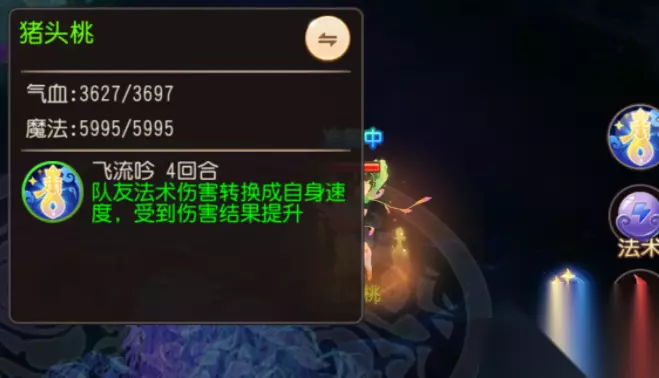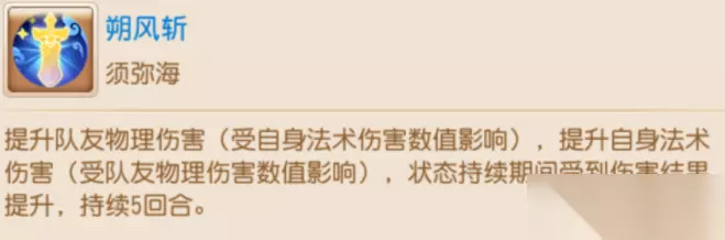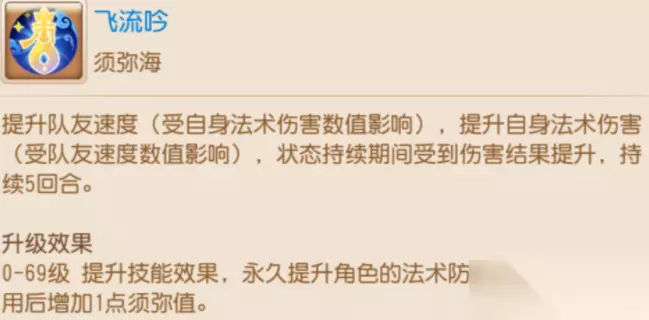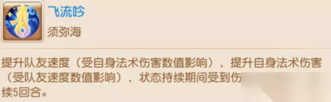 1.飞流吟和朔风斩可以对除了自己之外的所有单位使用(助战召唤灵均可) 2.飞流吟和朔风斩释放之后,被释放单位和自己受到的伤害结果都会提升 须弥海的额外门派属性是法防和气血,介于龙宫和魔王之间