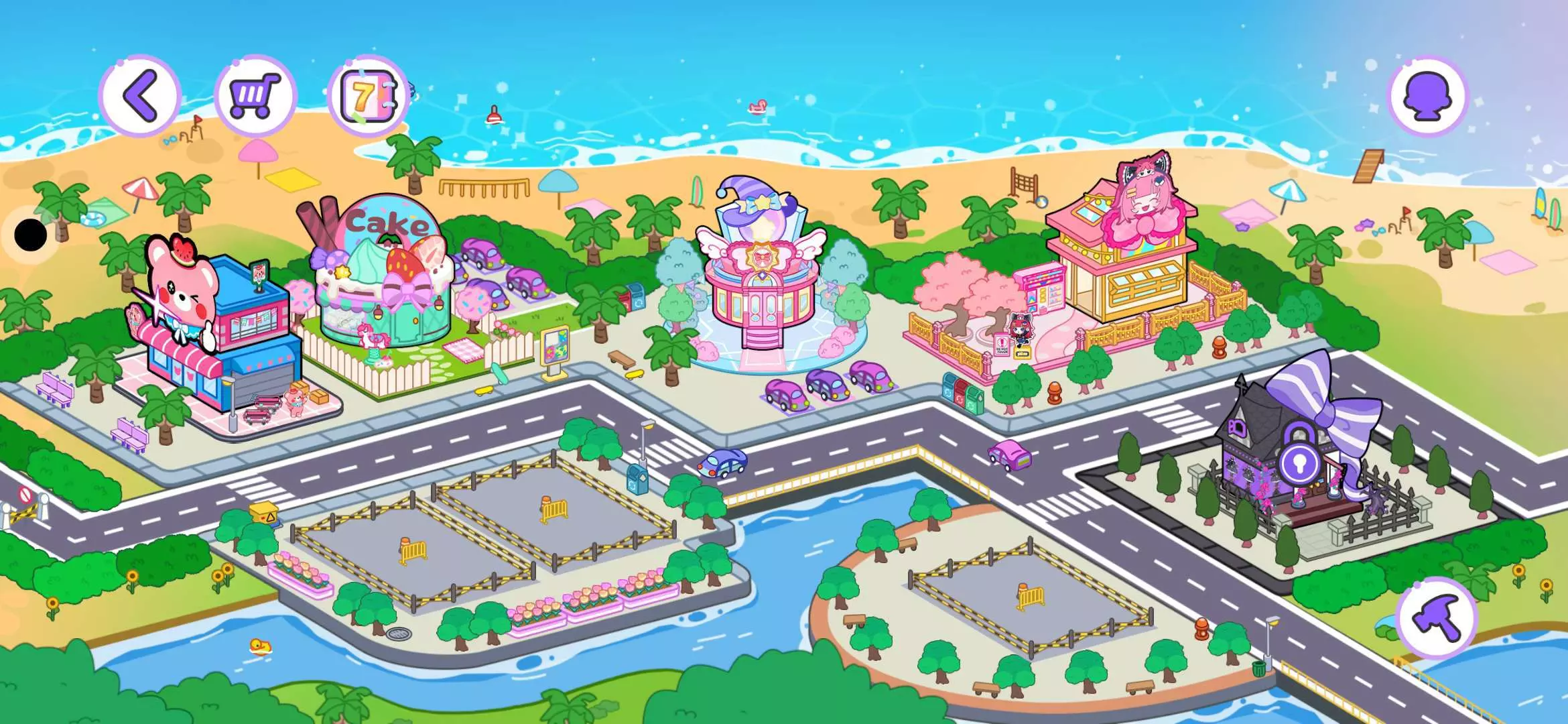 可爱类建筑 像马卡龙色的蛋糕屋、粉粉的旋转木马等都很吸引人 我们还可以看海浪拍打沙滩,棕榈树随风晃动🍭