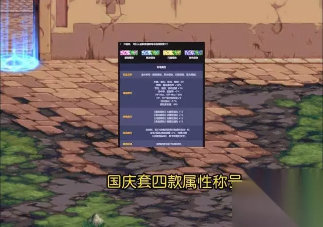 国庆套称号共有四款属性,分别是光、暗、火、冰增加15属强。称号基本属性增加70四维、12%暴击、17%攻击强化、攻击时3%几率增加10点所有属强和3%三速,持续40年,名望增加849。 整体来说称号属性一般般,相对于春节称号直接被碾压。该称号可以交易一次,可以买给小号过度用。 三、国庆套宝珠一栏