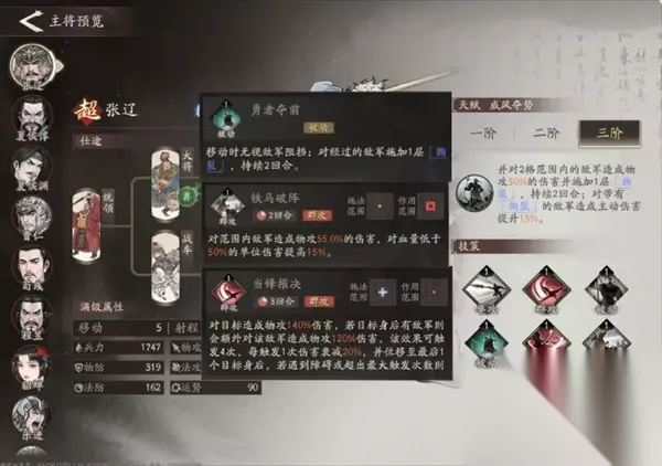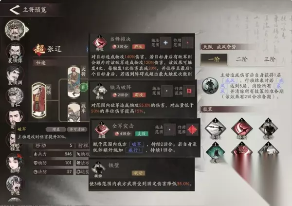 上面是新版天赋 分支选择:新版张辽的强度在线两个分支都可以选择,但玩法上有很大不同。 1.主帅流:适合友方的骑兵和战车较多时使用,利用兵种被动直接进行大军压境。 2.铁车流:通过超高的移动力与位移技能支取敌军中军,通过沿途附加撕裂和多次伤害刷新技能来保证自身输出。