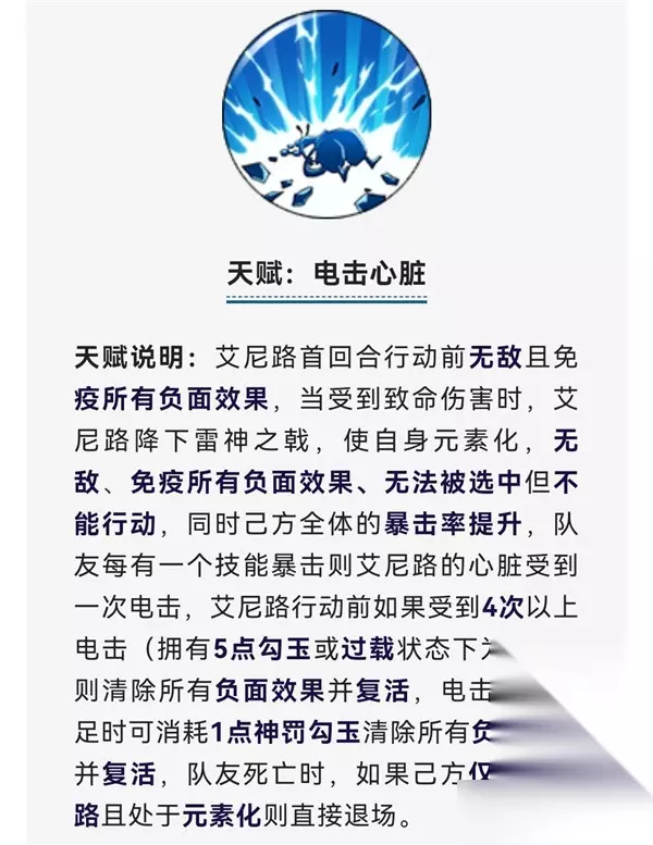 这个天赋是艾尼路的生存天赋,第1句话跟路飞有点像,艾尼路首回合无敌,而且免疫所有负面状态。 如果艾尼路受到致命伤害的话,自身将进入无敌状态,无法被选中,免疫负面状态,就跟布鲁克比较像,不过这个状态下不能行动,但是可以提高队友的暴击概率。 如果队友每有一个技能暴击,那就可以电击一下艾尼路的心脏,如果艾尼路收到4次电击,那他就会立马复活,并清除身上的负面状态。(如果艾尼路有5点勾玉,或者在过载状态下,那只用两次电击就可以让他复活了)。当然,如果最后只剩下一个队友和艾尼路,连两次电击都没有办法达到,那艾尼路就可以消耗一点神罚勾玉复活。 所以艾尼路的生存是没有什么问题的,当然如果最后只剩下艾尼路,而且处于元素化状态的话,艾尼路就会直接退场。 总结: 本次的艾尼路可以说是强得离谱,辅助能力那是目前的最强,光是一个让队友属伤可以暴击,就已经很离谱了,还加速度,攻击,命中,暴击,爆伤。 不仅如此,还可以首技能暴击,无法被打断,免疫控制,这下不仅狗子难活了,布琳才出来,也难逃一劫。 所以如果有资源,艾尼路是必须要搞的,甚至比艾斯和路飞还要更重要,因为他不仅是一个输出,还是一个辅助,真的太强了。 不过大家也可以稍微放心,经过了路飞和艾斯之后,平民玩家都没太多资源了,这次艾尼路完全就是为氪佬准备的,所以中低分段的玩家们还不用太紧张,但高分段如果没有艾尼路的话,那天梯就很难玩下去了。