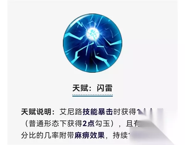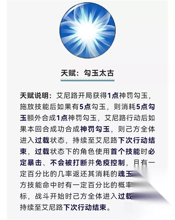艾尼路的技能暴击时就可以获得一点勾玉,普通状态下可以获得两个,而且暴击时还有概率附带麻痹效果,这就是上面那个天赋艾尼路或者勾玉的来源。 所以艾尼路除非可以一回合放5个技能或者不进入延展状态,不然是没有办法让队友每回合都在过载状态的,算是一点点的小平衡。