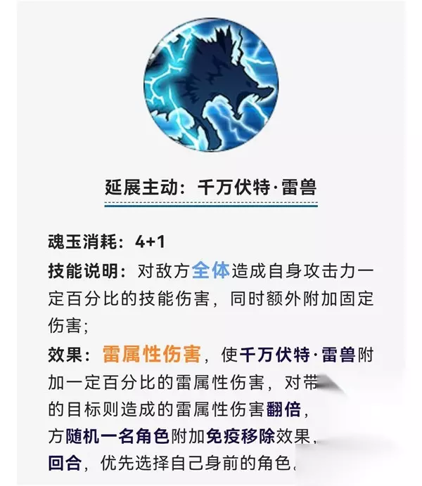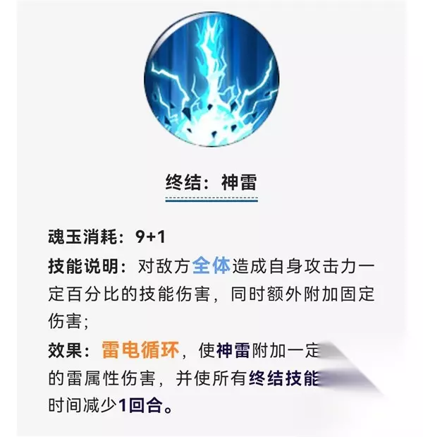 这是一个全体终结技,可以附带雷属性伤害,而且可以使自己所有终结技能的冷却减少一回合。