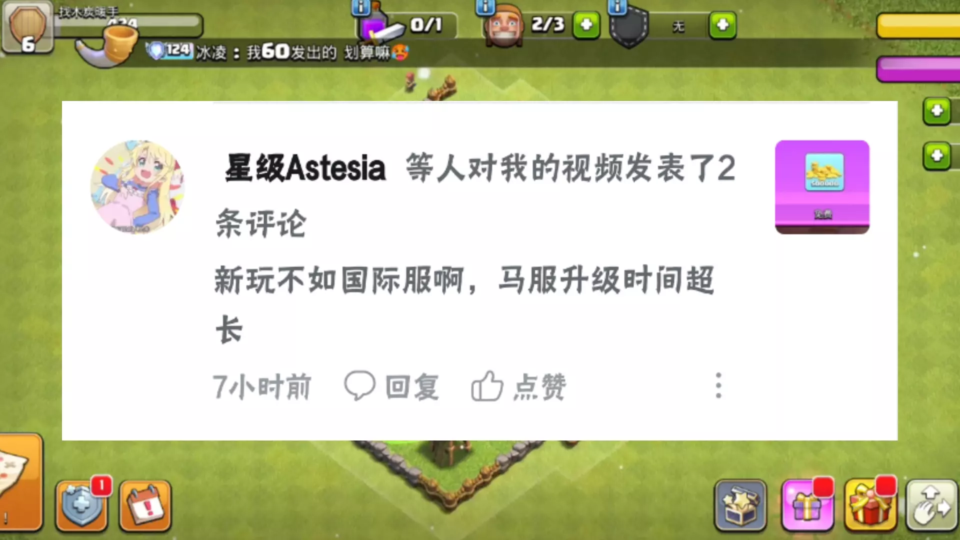 这是萌新入坑部落冲突国际服的第一天养成记录,展示了游戏内的基地布局,包括未研究兵种的1级实验室、5级圣水收集器、3级加农炮等建筑状态,是从零开始的部落冲突新手内容。