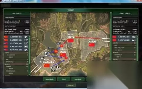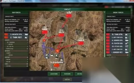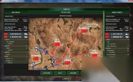 下面是小编整理的关于战争游戏红龙中国战役3分钟速通攻略攻略内容,介绍了战争游戏红龙中国战役怎么过,战争游戏红龙中国战役3分钟速通攻略等内容。 红龙战役 战争游戏红龙是一款策略战争类游戏作品,新作品中增加了很多新的游戏内容,实际游戏过程中对于各兵种的运用需要玩家对游戏比较熟练,最近有玩家分享了游戏3分钟速通攻略,有兴趣的玩家不妨试一试。 速通攻略 注意不同单位有不同的行动点数,步兵有3点,坦克只有2点,移动一次消耗2点,攻击消耗1点,所以步兵可以在移动之后立即进行攻击,但坦克等重型单位就只能在移动后等下个回合才能发动攻击。 Rgt.是团级单位,棋子上有旗帜,只有团级单位才有后勤补给能力和多名指挥官,是战斗的主力。 BTN是营,虽然拥有独立作战能力,但是仅有营长1名指挥官,并且没有后勤补给单位,这点需要注意。营级单位更适合协助团级单位一起作战。不过本攻略强调快速推进,所以会有一个营独当一面的情况。 Coy.就是连,无法独自作战,只能依靠团、营级单位参战。 第0天——