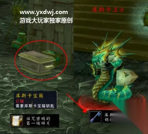 诅咒密码的第一块碎片坐标 我们需要在附近击杀名为【库斯卡卫士】的怪物,直到掉落钥匙为止。 有了钥匙直接去打开库斯卡宝箱,就能够拿到里面的第一块碎片道具了。