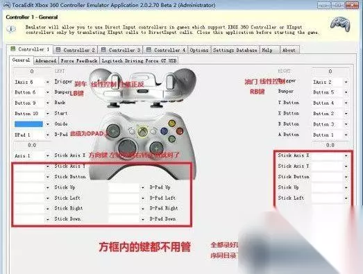 G27和普通方向盘都能玩极品18 极品飞车18不支持方向盘的行为让我这刚入手罗技G27的屌丝情何以堪!!!气急败坏之下,让我坚定了一个念头:我就要用方向盘!!于是我开始了针对G27的实验,一次又一次的调试。 言归正传。思路很简单,用方向盘模拟360手柄(官方没说不支持手柄啊)。这个方法网上有,但亲测下来没一个能用的,下面是我自己做的可以用的,有DFGT的骚年下载XInput Test.rar后就可以关闭本贴后进游戏嘚瑟了。用法很简单,解压后将所有文件全部复制到游戏目录下,进入游戏,你会发现方向盘奇迹般的可以用了。按键说明:×=A,○=B,□=X,Δ=Y(符号真难找...);左\右桨(盘子背面那两个键)=LB\RB(油门刹车上下左右开始返回就不用我说了吧)。需要提一下的是,进游戏之前建议在盘子驱动上修改转动度数为180度,否则进游戏后死区大的让你怀疑你的盘子还是不是个纯爷们...... OK,解决。 当然,如果你的盘子并非我所说的DFGT,又或者你根本对盘子不感冒,却又想用盘子或其他手柄来玩这个用盘子玩其实手感也不怎么样的游戏,那我给你更详细的过程。 在 开始我上面说的过程之前,由于我并未测试别的设备的键值是多少,所以将具体制作方法公布,大家可以DIY一套适合自己的键值,我保证只要键值对了,哪怕你 是前天市场上淘的20块的手柄,插上电脑照样可以玩18。制作方法:两个软件(其实是同一个软件的两个版本,让人发愁的是两个版本都不好使),一个名叫 XInput Test,另一个叫X360ce(眼熟吧...),它们的功能都是生成一个x360ce.ini的配置文件和与其配套的.dll文件,然后直接在游戏里模拟360手柄按键指令。这个.ini的配置文件里保存了盘子(或手柄,呵呵呵呵)上 的键与模拟器各个键相对应的键值。至于各个键对应的键值是多少,就要用到X360ce.exe。打开软件你会发现有好多键位,但实际上能用到的 键就是我在上文提到的那些键,其它键可闲置。见下图,360手柄上的每一个键的旁边都有下拉箭头,我们将我们不知道键值的键所对应的位置的下拉菜单打开, 点选[record]后按下我们想读取键值的键来定义键值,成功后会有叮的一声,并且再按的时候回发现模拟器上对应的键变绿色。当然,此时显示的键名并非 键值,键值要在所有键定义完毕后在程序目录下找到.ini配置文件里找,然后用选取这些键值中需要的键值来填下面的配置,填好以后才能开始开头说的第一 步。 下面是X360ce.ini的参数中文解释,方便大家改键; [Options] UseInitBeep=1 #初始化,默认为1,不要改 Log=0 #是否创建LOG文件,默认为0,不要改 [PAD1] #手柄1,如果你需要两个手柄,就在最下面新建[PAD2]复制以下信息 Index=0 #此控制器是否有效; 0 有效; -1 无效 Left Analog X=1 #左类比摇杆横轴键值,控制方向的;此值参照x360ce.exe生成的.ini的数值 Left Analog Y=7 #左类比摇杆纵轴键值, 本游戏内无效,所以设为7 Right Analog X=7 #右类比摇杆横轴键值,同上 Right Analog Y=7 #右类比摇杆纵轴键值,同上 Left Analog X Linear=0 #左类比摇杆横轴灵敏度,-100~+100之间,数值越大越灵敏 Left Analog Y Linear=0 #左纵灵敏度,同上 Right Analog X Linear=0 #右横,同上 Right Analog Y Linear=0 #同上 Left Analog X+ Button=0 #估计是非线性键模拟线性控制键键值,基本无用,0为无效 Left Analog X- Button=0 #同上 Left Analog Y+ Button=0 #同上 Left Analog Y- Button=0 #同上 Right Analog X+ Button=0 #同上 Right Analog X- Button=0 #同上 Right Analog Y+ Button=0 #同上 Right Analog Y- Button=0 #同上 D-pad POV=1 #方向键数量,填1 D-pad Up=0 #上键键值,本游戏中不用动,0就可以 D-pad Down=0 #下键键值,同上 D-pad Left=0 #左键键值,同上 D-pad Right=0 #右键键值,同上 A=1 #A键键值,参考X360ce.exe生成的数值 B=3 #B键键值,同上 X=2 #不解释 Y=4 #不解释 Left Shoulder=6 #就是LB键键值,参考X360ce.exe生成的键值 Right Shoulder=5 #RB键键值,同上 Back=9 #返回键键值,同上 Start=10 #开始键键值,同上 Left Thumb=11 #没用; 设为0 Right Thumb=12 #同上 TriggerDeadzone=0 #扳机(L\RT)死区范围值,0为默认,不要改 Left Trigger=a-6 #左扳机(LT)键值,对应游戏中刹车,参考X360ce.exe生成的数值 Right Trigger=a-2 #右扳机(RT)键值,对应游戏中油门,同上 UseForceFeedback=1 #是否应用力反馈,0否,1是 SwapMotor=0 #是否对调力反馈马达,手柄有用,方向盘直接没用,0否,1是 ForcePercent=100 #力反馈力度值,0~100%,凭个人爱好 ControllerType=2 #控制器类型,手柄1,方向盘2,摇杆3,飞行摇杆4,跳舞毯5,电吉他6; DRUM_KIT 8; AxisToDPad=0 #是否用转轴控制方向键,设为0 AxisToDPadDeadZone=256 #转轴控制方向键后的死区,由于上个数值是0,所以无效 AxisToDPadOffset=0 #转轴控制方向键补偿值,同上 POVXReverse=0 #是否反转方向键横轴 POVYReverse=0 #是否反转方向键纵轴 [PAD2] Index=-1 #此控制器2无效,以下省略 注意: 以上内容可直接复制粘贴至文本文档内容里并保存为X360ce.ini,但必须与我上传的XInput Test.RAR内的其他文件配合才能生效,改键完毕后请在关闭改键软件后运行游戏。 那么,这样做其实是绕了圈子,为什么要这样呢?因为这个X360ce.exe配置出来的ini在极品18中是不起作用的,只能用他弟Input test.exe配置出来的ini和.dll。虽然麻烦,但这两兄弟配合起来还是可以圆我广大屌丝的方向盘梦的。最后,屌丝万岁!