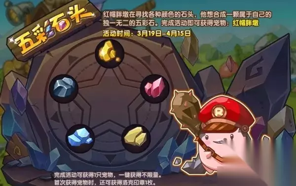 洛克王国五彩石头活动攻略: 红帽胖墩在寻找各种颜色的石头,他想合成一颗属于自己的独一无二的五彩石。帮它一起合成吧,完成活动即可获得宠物:红帽胖墩。 首次获得宠物时,还可以获得洛克印章1枚。 活动时间:3月19日-4月15日 活动地图:巨石残垣 活动获得:红帽胖墩,洛克印章