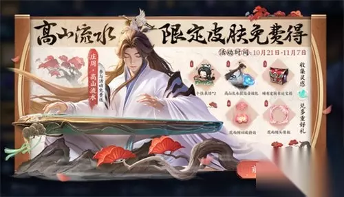 首先庄周的六周年限定皮肤高山流水需要通过参与【一曲知音 惟愿与你】活动获得,活动的时间是10月21日-11月7日,活动位置在活动面板-周年庆-【惟愿与你】免费领皮肤。 活动期间,玩家需要通过完成任务,或者参与太古遗音完成音游章节的小游戏,获得灵感值,使用灵感值兑换皮肤,或者其他奖品。 灵感值的获取方法有以下四种: 1.每日任务:每日登录游戏;每日分享活动1次;每日参与排位赛或巅峰赛1次;每日组队参与1场5V5对局;每日参与2场5V5对局。 2.每周任务:每周累计登录3次;每周累计参与5V5对局6次;每周累计参与5V5对局6次。 3.10月30日灵感福利:10月30日登录游戏;10月30日穿戴高山流水皮肤或与穿戴高山流水皮肤的队友同队对局一次。 4.完成音游章节获得灵感:累计灵感值到达规定数量可以开启相应的音游章节,音游章节共分为四章,成功完成章节可以获得额外的灵感值奖励。